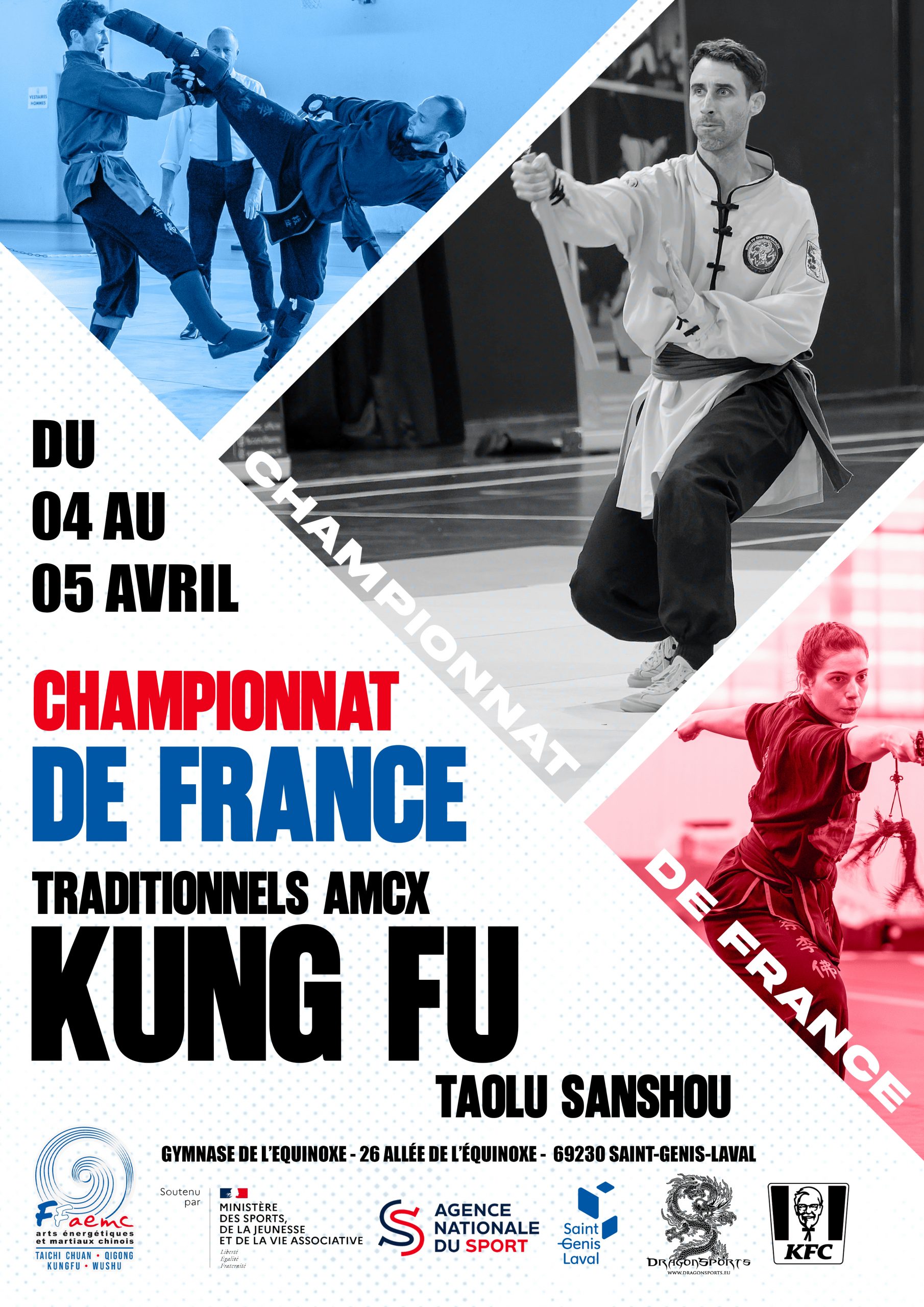 Se tiendront le week-end du 4 au 5 avril 2026, le Championnat et la Coupe de France 2026 de KUNGFU (AMCX), à St Genis Laval (69) à côté de LYON.