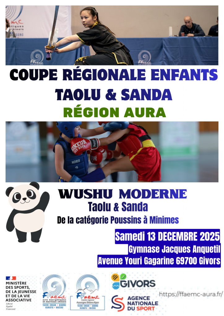 La Coupe Régionale Enfants AURA 2025 WUSHU (Taolu et Sanda) est exclusivement réservé aux licenciés de la région AURA.